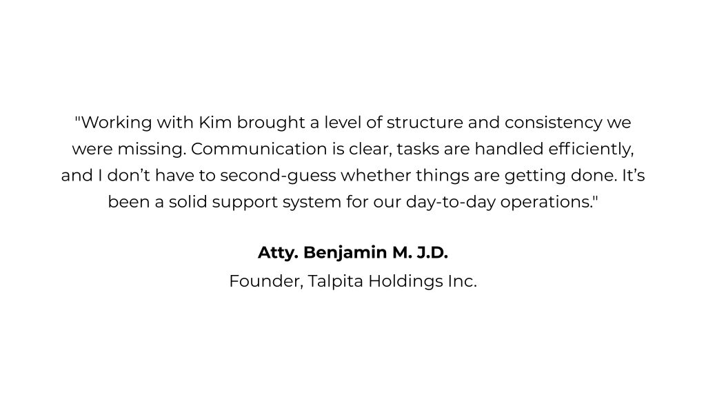 “Working with Kim brought a level of structure and consistency we were missing. Communication is clear, tasks are handled efficiently, and I don’t have to second-guess whether things are getting done. It’s been a solid support system for our day-to-day operations.”