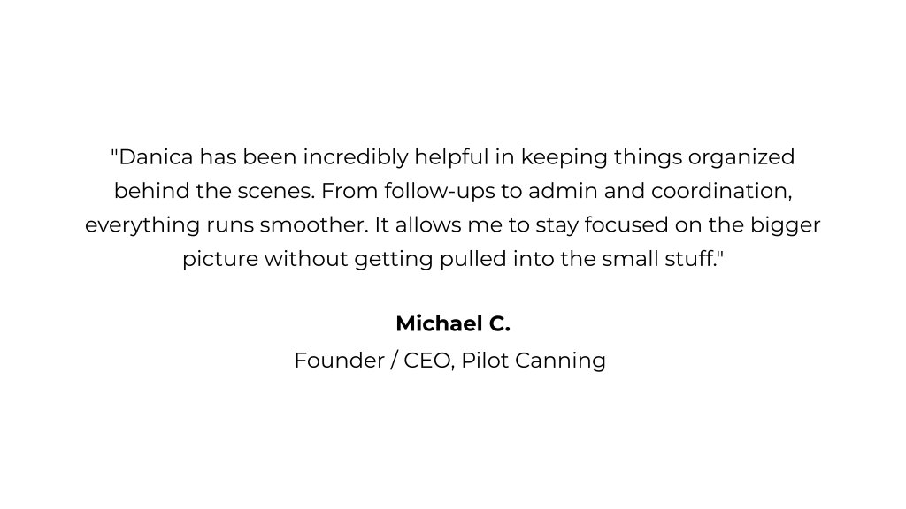 “Danica has been incredibly helpful in keeping things organized behind the scenes. From follow-ups to admin and coordination, everything runs smoother. It allows me to stay focused on the bigger picture without getting pulled into the small stuff.”