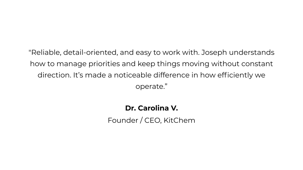 “Reliable, detail-oriented, and easy to work with. Joseph understands how to manage priorities and keep things moving without constant direction. It’s made a noticeable difference in how efficiently we operate.”
