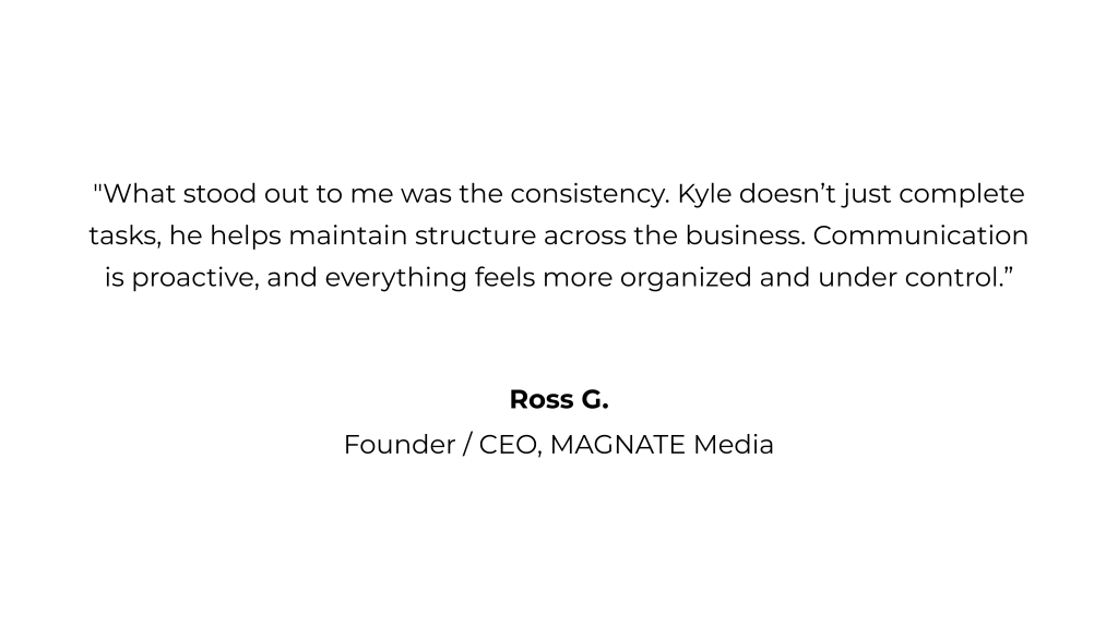 “What stood out to me was the consistency. Kyle doesn’t just complete tasks, he helps maintain structure across the business. Communication is proactive, and everything feels more organized and under control.”